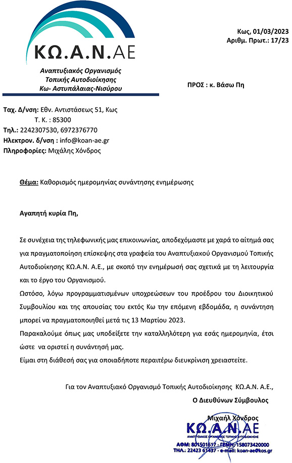 «Προσπαθήσαμε να επικοινωνήσουμε με την ΚΩΑΝ για να έχουμε σήμερα 2/3/2023 συνάντηση – ενημέρωση για όσα «κάνει» η εν λόγω εταιρεία.