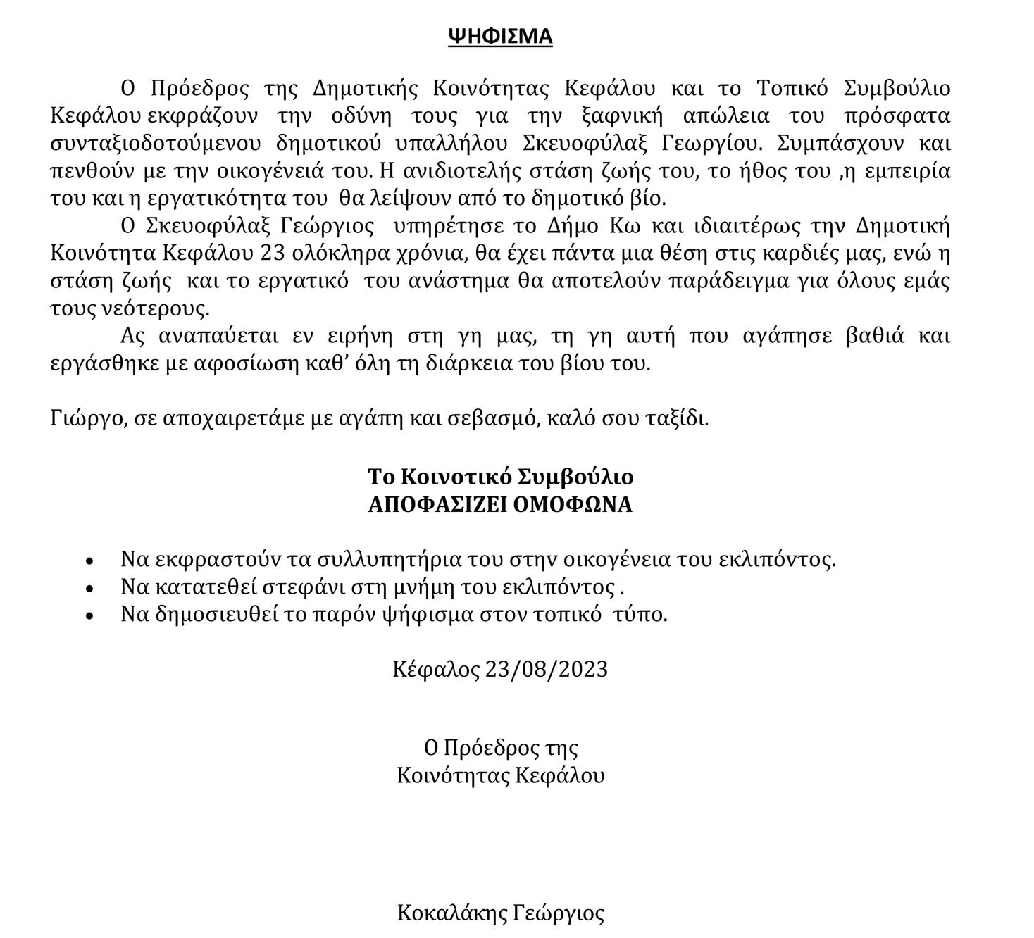 Η μεγάλη οικογένεια του Δήμου μας θρηνεί ένα ακόμη μέλος της, τον συνταξιούχο δημοτικό υπάλληλο Γιώργο Σκευοφύλαξ.