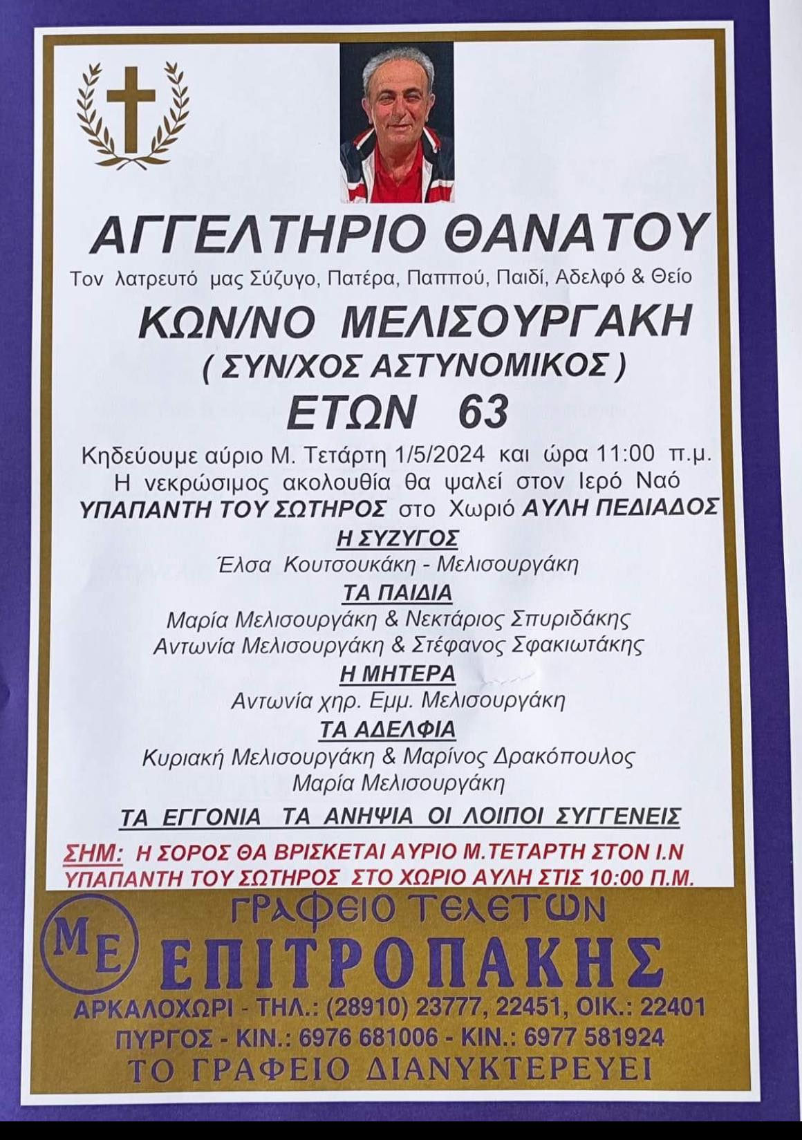 Έφυγε από τη ζωή σε ηλικία 63 ετών ο Κωνσταντίνος Μελισουργάκης (συνταξιούχος αστυνομικός), μετά από μάχη που έδινε τα τελευταία 2, χρόνια, με την επάρατη νόσο.