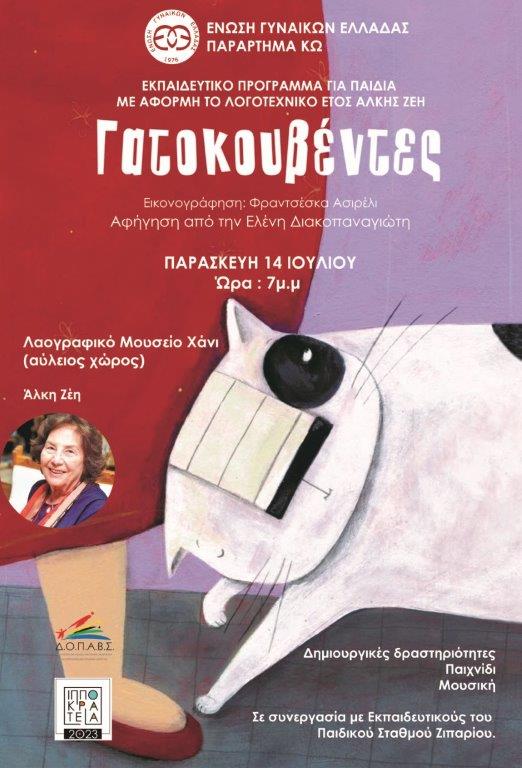 Η Ένωση Γυναικών Ελλάδας- Παράρτημα Κω με τη συνεργασία του ΔΟΠΑΒΣ πραγματοποιεί εκπαιδευτικό πρόγραμμα για παιδιά την Παρασκευή 14 Ιουλίου και ώρα 7μ.μ. στο Λαογραφικό Μουσείο Χάνι(αύλειο χώρο), στα πλαίσια του Λογοτεχνικού Έτους Άλκης Ζέη.