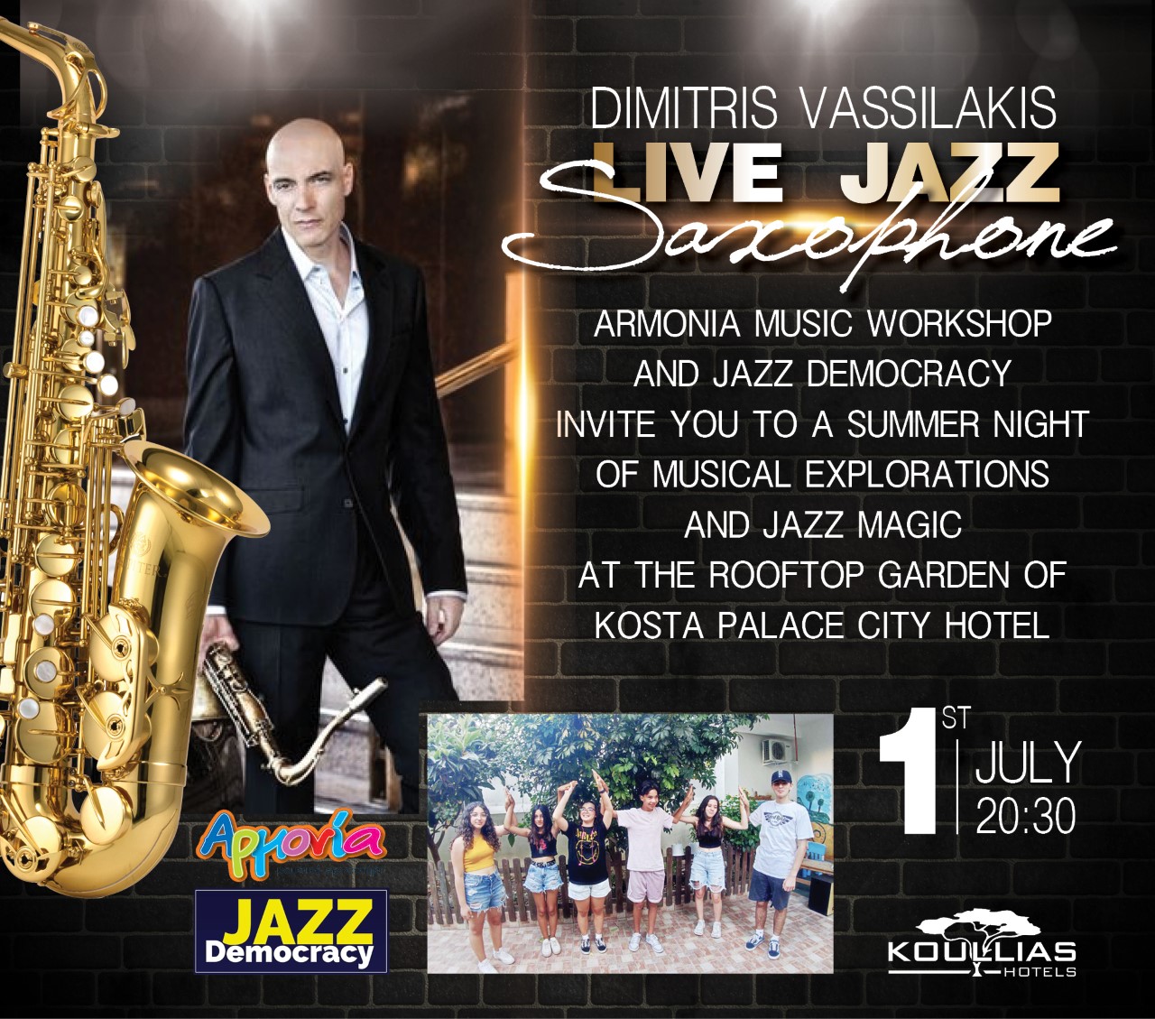 Με μεγάλο ενδιαφέρον περιμένει η Κως την καλοκαιρινή εκδήλωση που οργανώνει η μουσική σχολή Αρμονία με τίτλο: «Dimitris Vassilakis live jazz saxophone», στο roof garden του ξενοδοχείου Kosta Palace στην Κω, την Παρασκευή 1η Ιουλίου, ώρα 20.30 το βράδυ ανοικτή στο κοινό. Η ιδιαίτερη αυτή μουσική συνεργασία, ενθαρρύνει τη γνωριμία με το σαξόφωνο, «ένα όργανο μαγικό καθώς αποτελεί επέκταση του σώματος και της ψυχής» όπως λέει ο Δημήτρης Βασιλάκης.