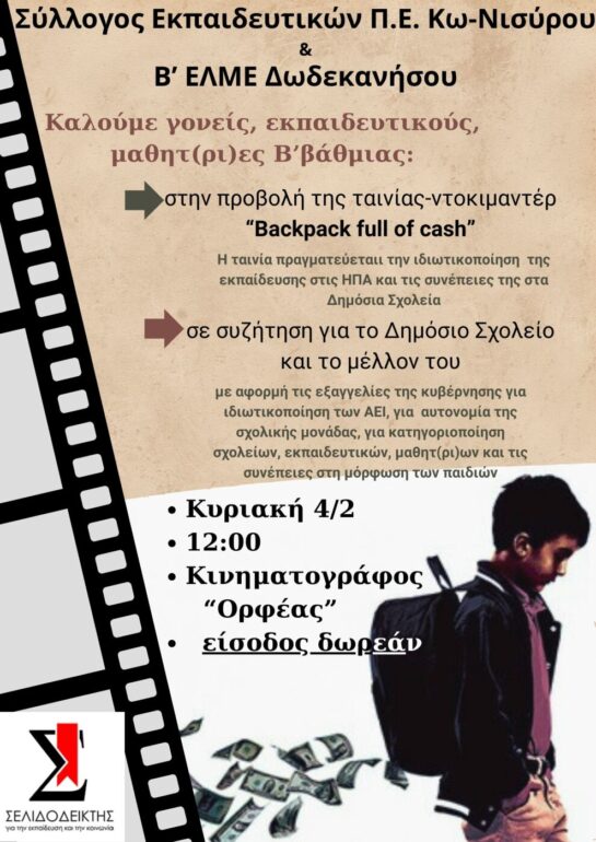 Ο Σύλλογος Εκπαιδευτικών Π.Ε και η Β΄ΕΛΜΕ Δωδεκανήσου, σας προσκαλούν στην προβολή της ταινίας- ντοκιμαντέρ «Backpack full of cash», την Κυριακή 4/2/2024, στις 12:00 μμ, στον κινηματογράφο Ορφέας. Η είσοδος είναι δωρεάν. Η ταινία πραγματεύεται τις καταστροφικές επιπτώσεις της