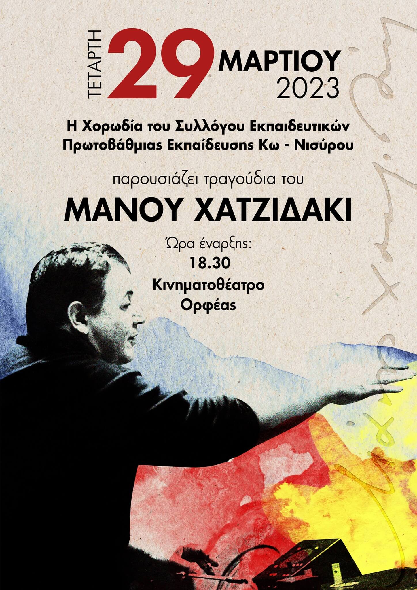 Η Χορωδία του Συλλόγου Εκπαιδευτικών Πρωτοβάθμιας Εκπαίδευσης Κω-Νισύρου και ο Δ.Ο.Π.Α.Β.Σ. διοργανώνουν εκδήλωση με τραγούδια του Μάνου Χατζιδάκι την Τετάρτη 29 Μαρτίου 2023 στις 18:30 στον Χειμερινό Κινηματογράφο Ορφέα.