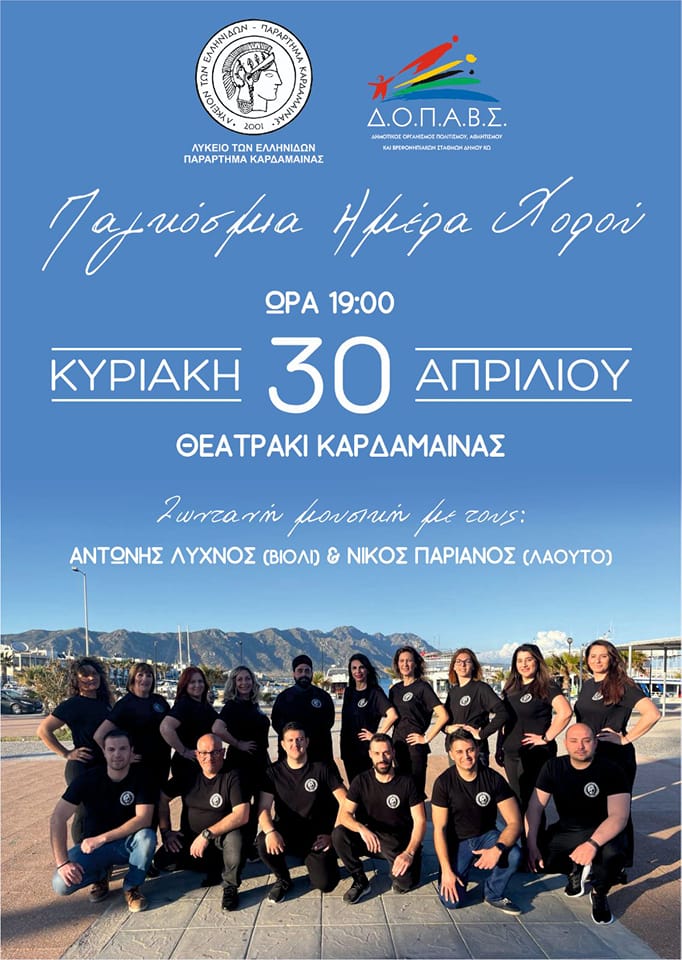 Το Λύκειο Ελληνίδων Παράρτημα Καρδάμαινας σε συνεργασία με τον ΔΟΠΑΒΣ διοργανώνει την Κυριακή 30 Απριλίου στο Θεατράκι Καρδάμαινας στις 19.00 διοργανώνει εκδήλωση με παραδοσιακούς χορούς και τραγούδια με αφορμή την Παγκόσμια Ημέρα Χορού .