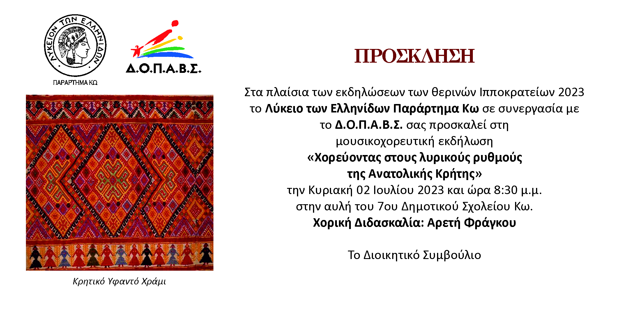 Μουσικοχορευτική εκδήλωση με τίτλο ‘’ Χορεύοντας στους λυρικούς ρυθμούς της Ανατολικής Κρήτης ‘’ με χορική διδασκαλία από την κ. Αρετή Φράγκου διοργανώνει το Λύκειο Ελληνίδων Κω σε συνεργασία με τον ΔΟΠΑΒΣ την Κυριακή 2 Ιουλίου στις 8.30 το βράδυ στην αυλή του 7ουΔημοτικού Σχολείου.