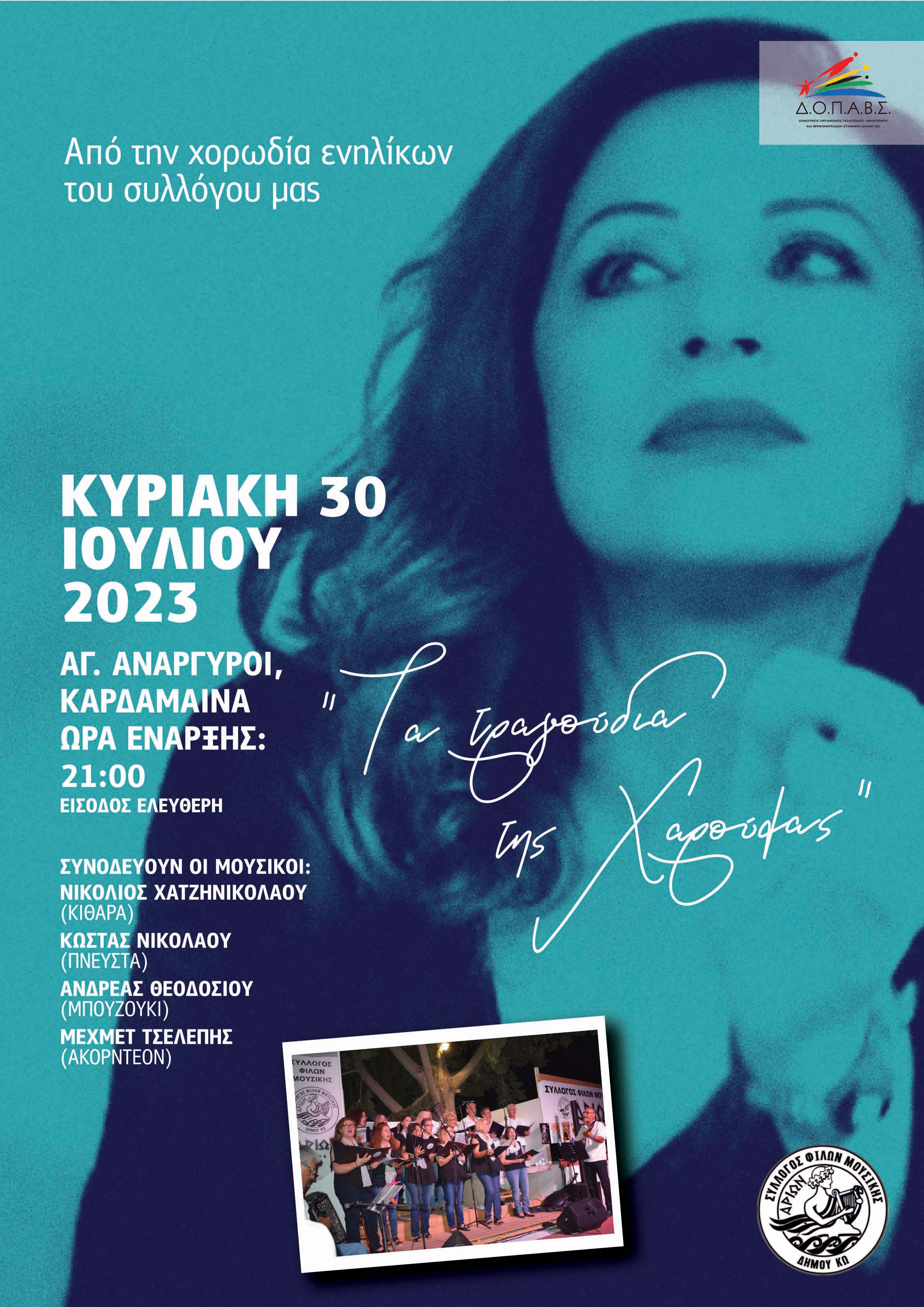 Στον υπέροχο χώρο των Αγ. Αναργύρων στην Καρδάμαινα, όπως πάντα την τελευταία Κυριακή του Ιουλίου στις 21.00.