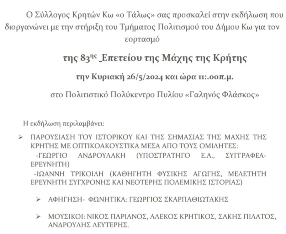 Eκδήλωση του Σ/γου Κρητών Κω " Ο ΤΑΛΩΣ" για την Μάχη της Κρήτης