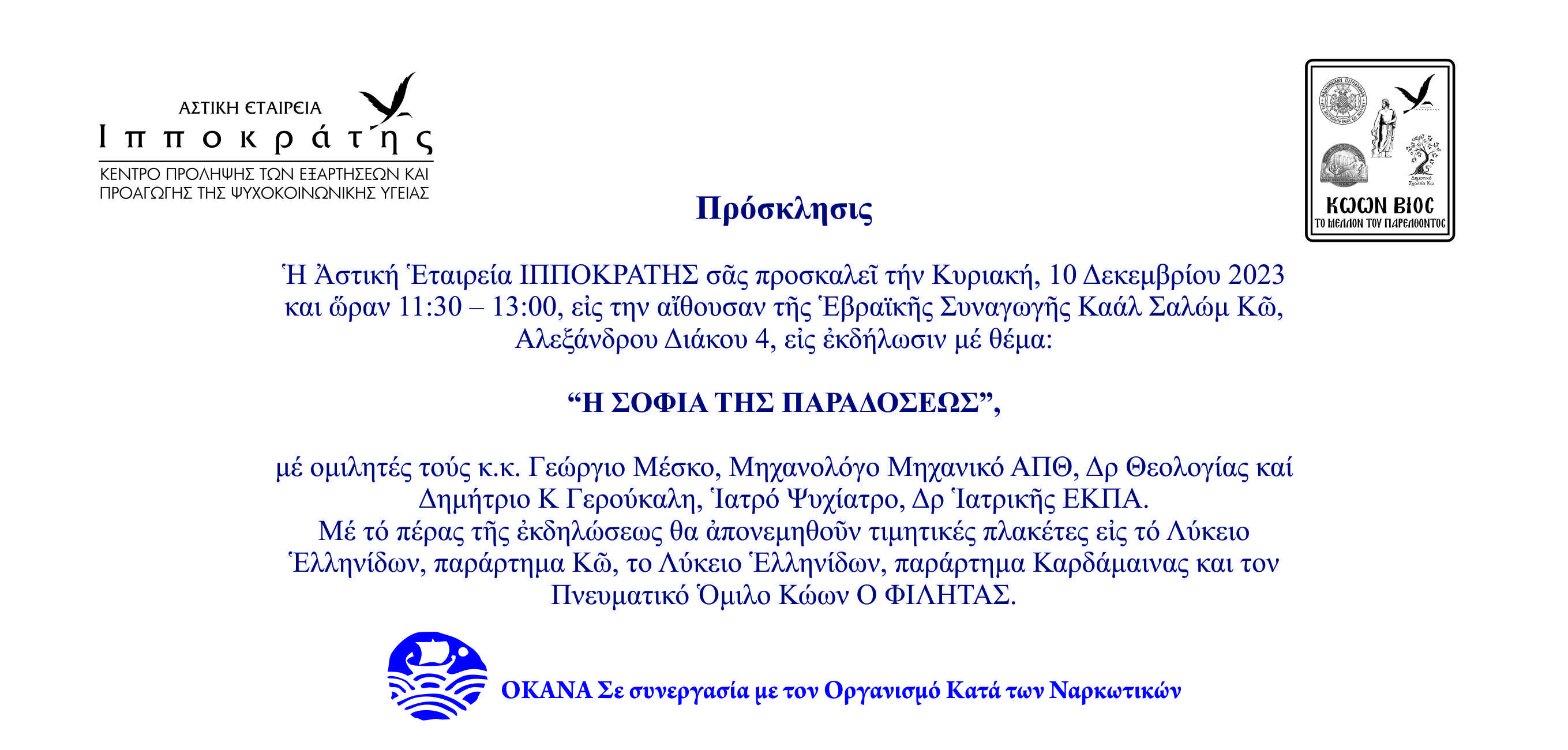 Η Αστική Εταιρεία ΙΠΠΟΚΡΑΤΗΣ, το Σάββατο, 09 Δεκεμβρίου 2023 και ώρα 11:00-13:00, στην αίθουσα της Εβραϊκής Συναγωγής Κω, Αλεξάνδρου Διάκου 4, διοργανώνει εκπαιδευτικό σεμινάριο με τίτλο:“OI ΔΥΟ ΔΡΟΜΟΙ ΤΗΣ ΓΝΩΣΗΣ”.