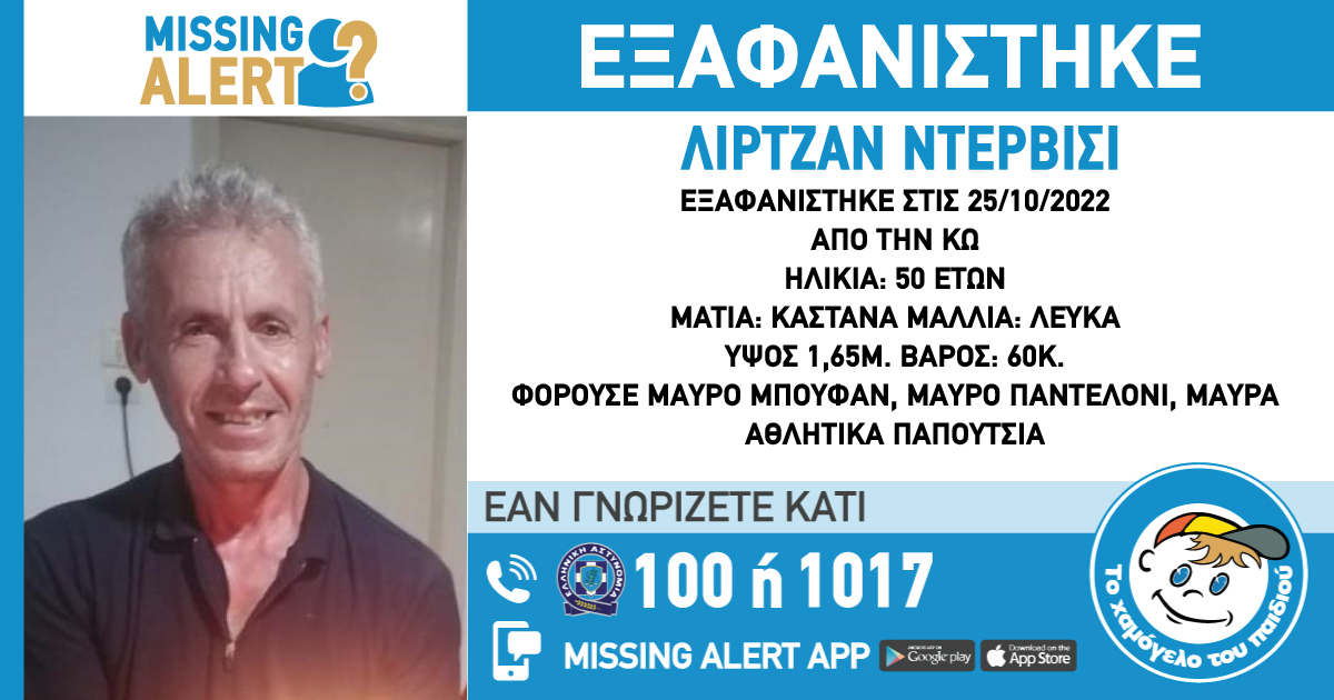 Στις 25/10/2022 και ώρα 12:00 εξαφανίστηκε από την περιοχή της Κω ο Ντερβίσι (επ) Λιρτζάν (ον), 50 ετών. Το «Χαμόγελο του Παιδιού» ενημερώθηκε για την εξαφάνιση του Ντερβίσι (επ) Λιρτζάν (ον) σήμερα, 26/10/2022 και προχώρησε στη δημοσιοποίηση των στοιχείων του ενήλικου κατόπιν αιτήματος της οικογένειάς του, καθώς ενδέχεται να συντρέχουν λόγοι οι οποίοι θέτουν τη ζωή του σε κίνδυνο.