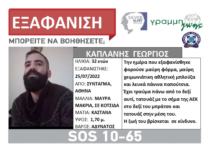 Ο Καπλάνης Γεώργιος, 32 ετών (είχε εργαστεί και διέμενε στο παρελθόν στην Κω), εξαφανίστηκε την 25/07/22 από την περιοχή της πλατείας Συντάγματος, στην Αθήνα.
