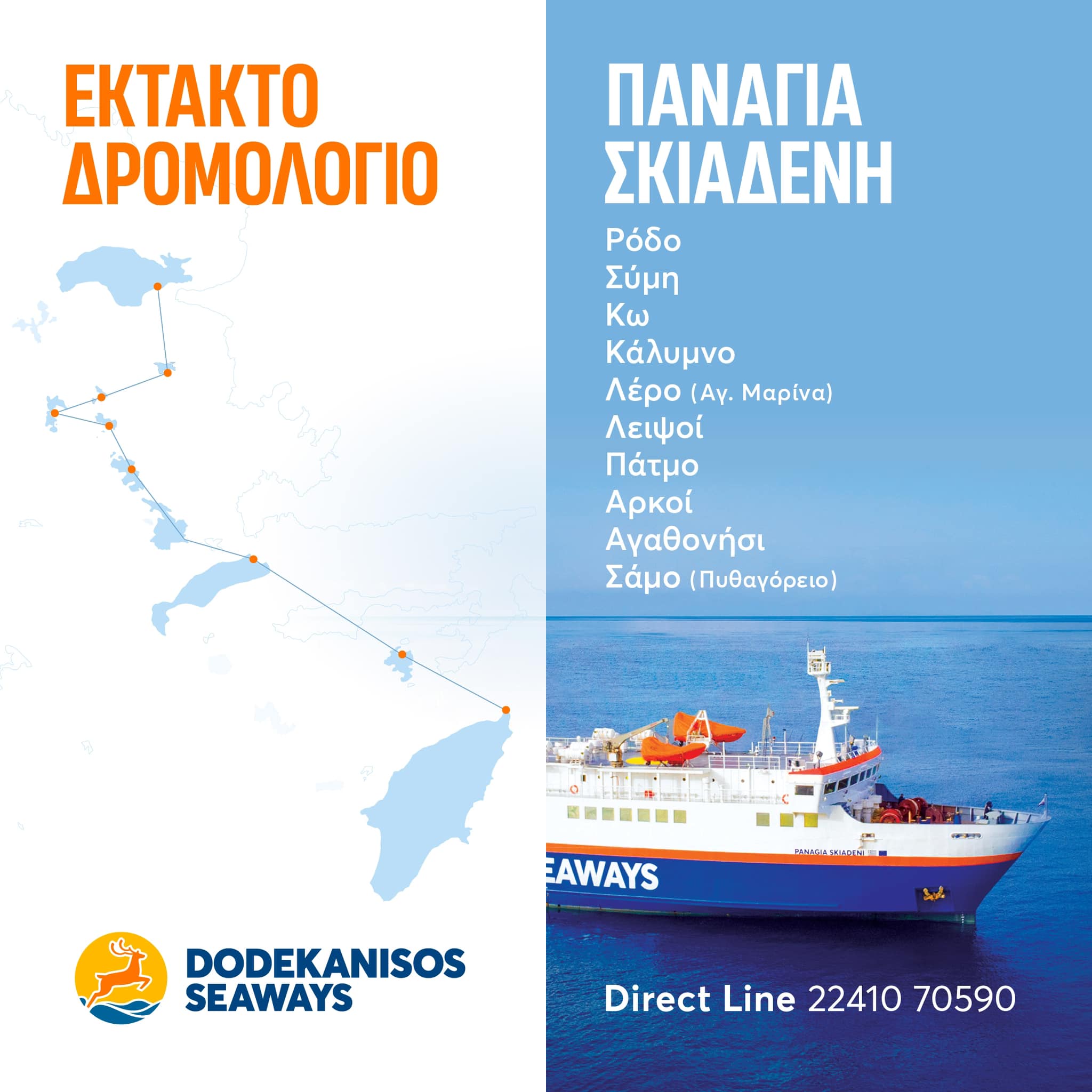 Σε συνέχεια των ελεύθερων δρομολογίων που πραγματοποίησαν τα ταχύπλοα καταμαράν μας, θα θέλαμε να σας ενημερώσουμε ότι το πλοίο Παναγιά Σκιαδενή, αφού ολοκλήρωσε με επιτυχία τις ετήσιες επιθεωρήσεις του, θα πραγματοποιήσει το παρακάτω δρομολόγιο, λόγω συγκοινωνιακών αναγκών.