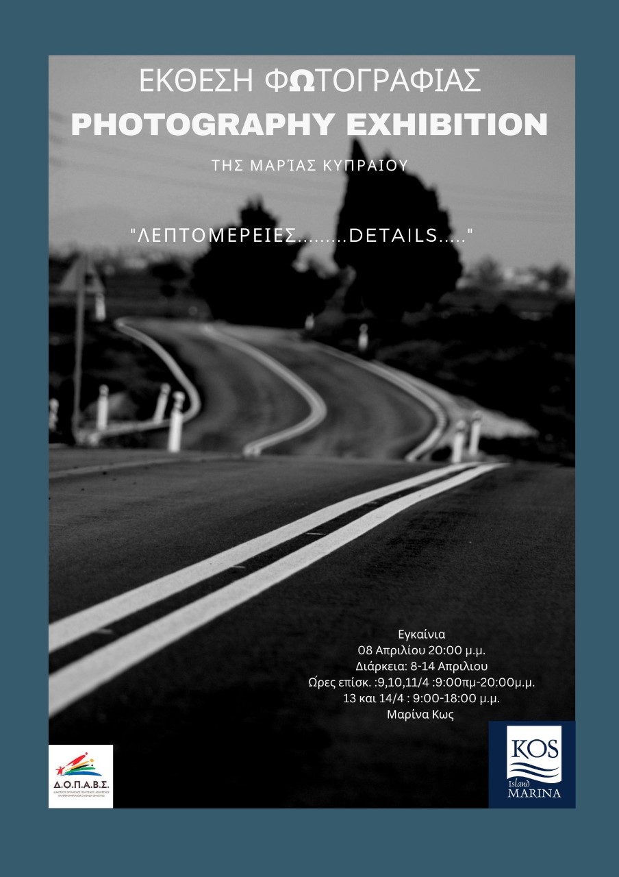 Έκθεση φωτογραφίας με τίτλο “Λεπτομέρειες…. Details” της Μαρίας Κυπραίου διοργανώνει ο ΔΟΠΑΒΣ και η Μαρίνα Κω. Τα εγκαίνια της έκθεσης θα πραγματοποιηθούν το Σάββατο 08 Απριλίου στην αίθουσα εκδηλώσεων της Μαρίνας στις 20:00.