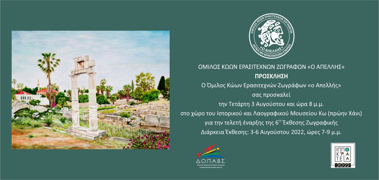 Ο Όμιλος Κώων Ερασιτεχνών Ζωγράφων «Απελλής» με την στήριξη του ΔΟΠΑΒΣ στα πλαίσια των Θερινών Ιπποκρατείων 2022 διοργανώνει την 6η Έκθεση Ζωγραφικής Ερασιτεχνών Ζωγράφων από την Τετάρτη 3 Αυγούστου 2022 μέχρι το Σάββατο 6 Αυγούστου 2022στο Ιστορικό Λαογραφικό Μουσείο-Χάνι.