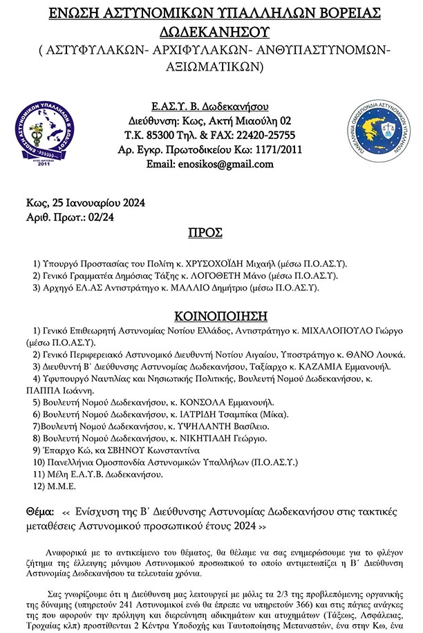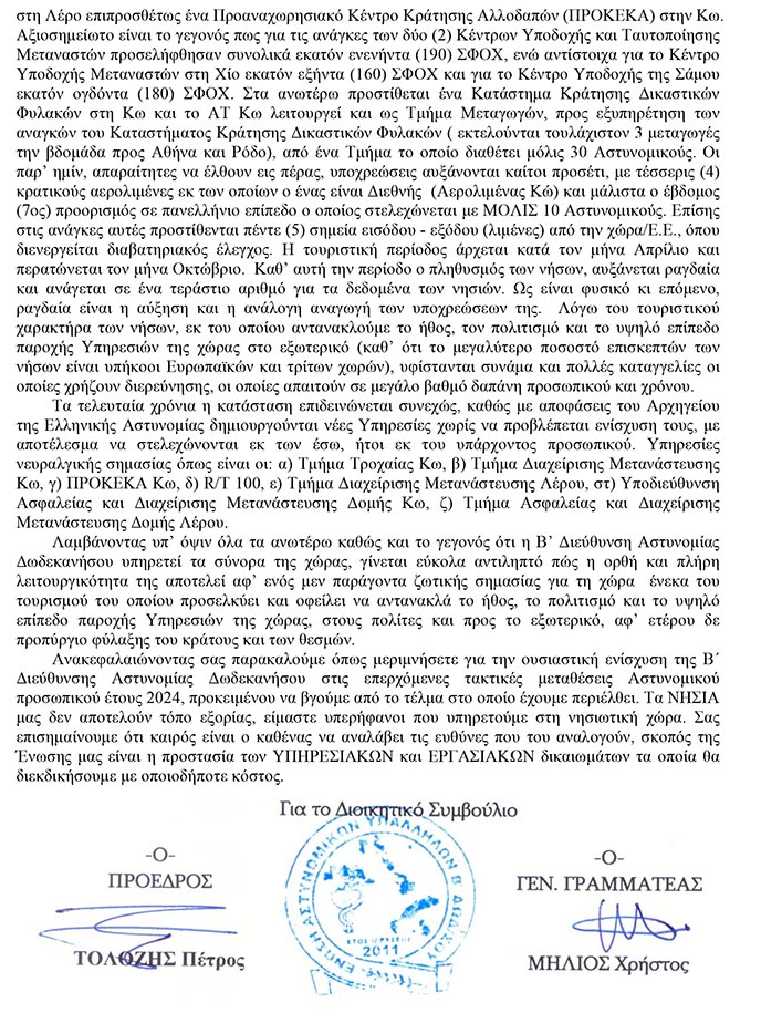 HomeΤοπικάΈνωση Αστυνομικών Β. Δωδ/σου: Τα νησιά δεν αποτελούν τόπο εξορίας - Άμεση ενίσχυση των Υπηρεσιών