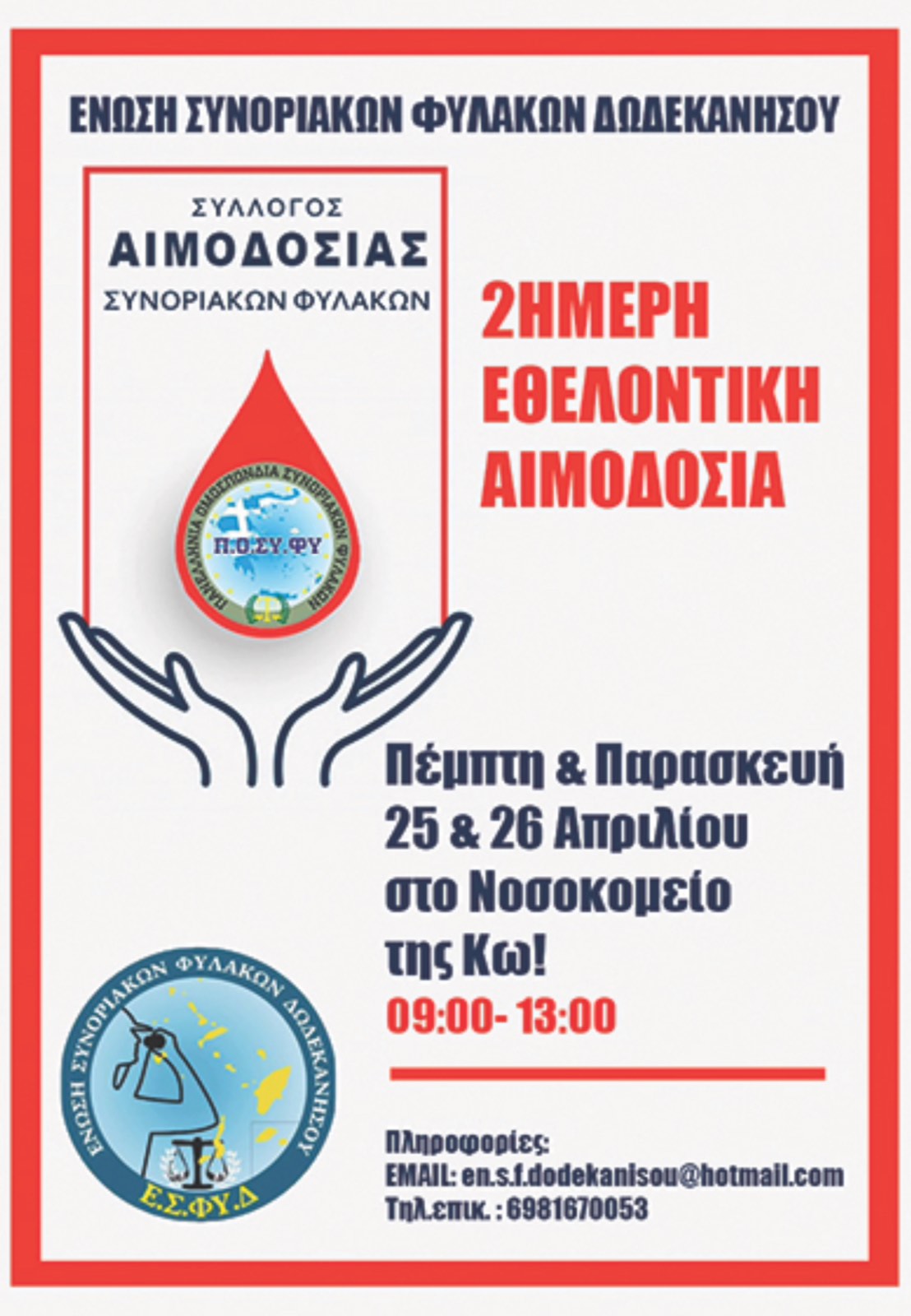 Διήμερα Εθελοντική αιμοδοσία στο Νοσοκομείο Κω από την Ένωση Συνοριακών Φυλάκων Δωδ/σου