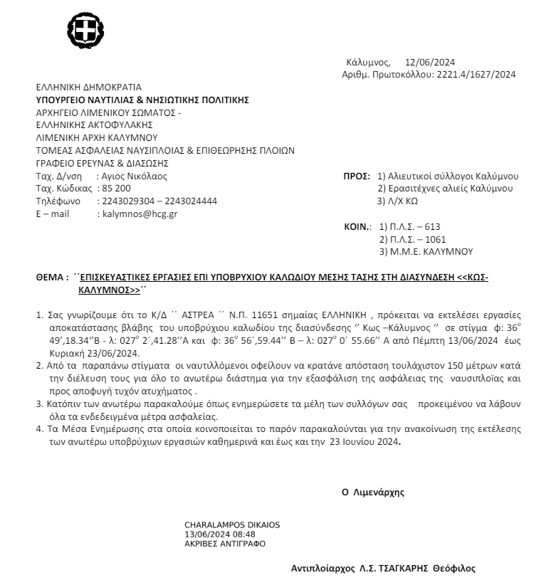 Δείτε αναλυτικά την ανακοίνωση του Λιμεναρχείου Καλύμνου.