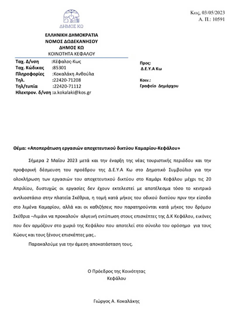 Επιστολές του Προέδρου της Κοινότητας Κεφάλου Γ. Κοκαλάκη σε Δήμο και ΔΕΥΑΚ για τα προβλήματα στο χωριό