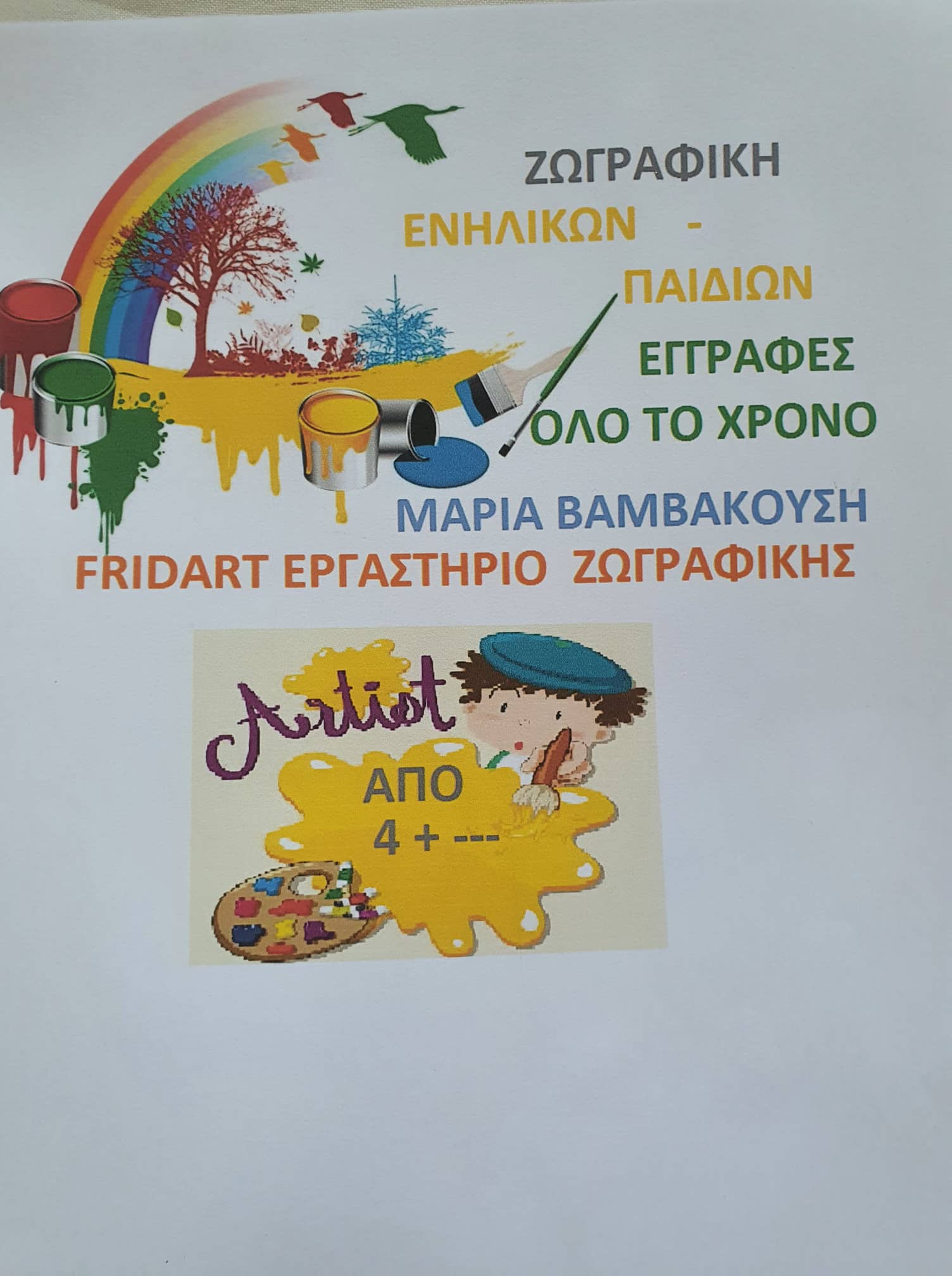 ΤΑ ΠΑΙΔΙΚΑ ΤΜΗΜΑΤΑ ΖΩΓΡΑΦΙΚΗΣ ΕΙΝΑΙ ΑΠΟ ΗΛΙΚΙΕΣ 4-18 ΤΑ ΠΑΙΔΙΑ ΘΑ ΠΕΙΡΑΜΑΤΙΣΤΟΥΝ ΜΕ ΤΑ ΧΡΩΜΑΤΑ ΚΑΙ ΤΙΣ ΔΙΑΦΟΡΕΣ ΤΕΧΝΙΚΕΣ ΤΗΣ ΖΩΓΡΑΦΙΚΗΣ. ----(ΚΟΛΑΖ, ΧΕΙΡΟΤΕΧΝΙΕΣ, ΚΑΙ ΑΝΑΦΟΡΕΣ ΣΤΗΝ ΙΣΤΟΡΙΑ ΤΗΣ ΤΕΧΝΗΣ ) ΑΝΑΚΑΛΥΠΤΟΥΝ ΤΟΥΣ ΣΥΝΔΙΑΣΜΟΥΣ ΤΩΝ ΧΡΩΜΑΤΩΝ ΤΩΝ ΜΟΡΦΩΝ ΜΕ ΟΔΗΓΟ ΤΗ ΦΑΝΤΑΣΙΑ ΤΟΥΣ ΚΑΙ ΤΗΝ ΠΡΟΣΩΠΙΚΗ ΤΟΥΣ ΕΜΠΝΕΥΣΗ.