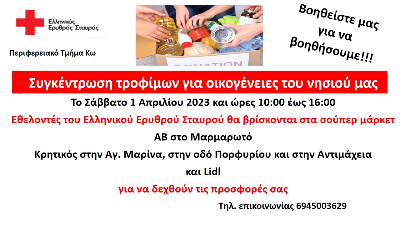 Το Σάββατο 1η Απριλίου εθελοντές του Ερυθρού Σταυρού Κω θα βρίσκονται σε σούπερ μάρκετ του νησιού μας προκειμένου να συγκεντρώσουν τρόφιμα για οικογένειες του τόπου μας. Οι προσφορές θα γίνονται δεκτές 10 το πρωί με 4 το μεσημέρι.