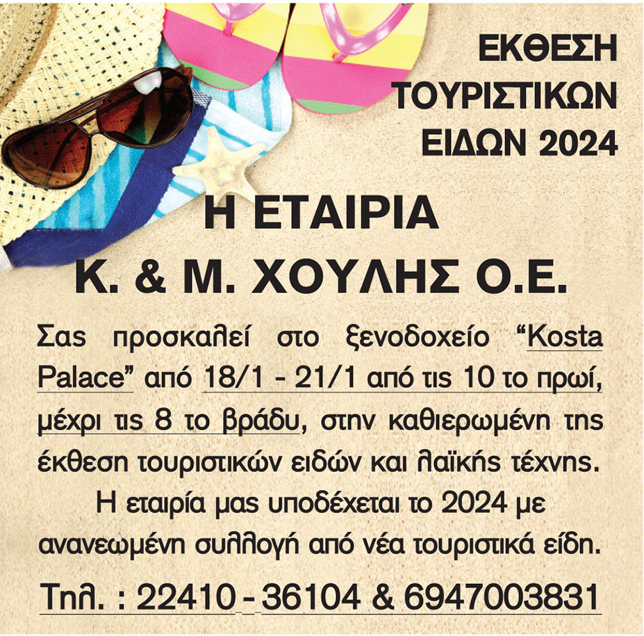 Εταιρία Κ. & Μ. Χούλης Ο.Ε.: Έκθεση τουριστικών ειδών από 18 - 21/1 στο ξεν. "Kosta Palace" στην Κω