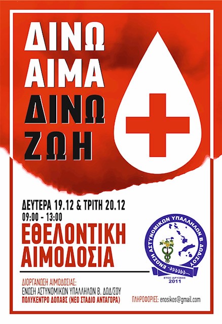 Η Ένωση Αστυνομικών Υπαλλήλων Βόρειας Δωδεκανήσου, την Δευτέρα 19 και την Τρίτη 20 Δεκεμβρίου 2022, σε συνεργασία με το κέντρο αιμοδοσίας του Γ. Νοσοκομείου Κω πρόκειται να διοργανώσει εθελοντική αιμοδοσία και απευθύνει ανοιχτή πρόσκληση προς τους πολίτες της νήσου Κω, με σκοπό την ενίσχυση της Τράπεζας Αίματος της Ένωσης μας. Η αιμοδοσία θα λάβει χώρα στο πολύκεντρο ΔΟΠΑΒΣ (νέο στάδιο Ανταγόρα) κατά τις ώρες 09:00 – 13:00.