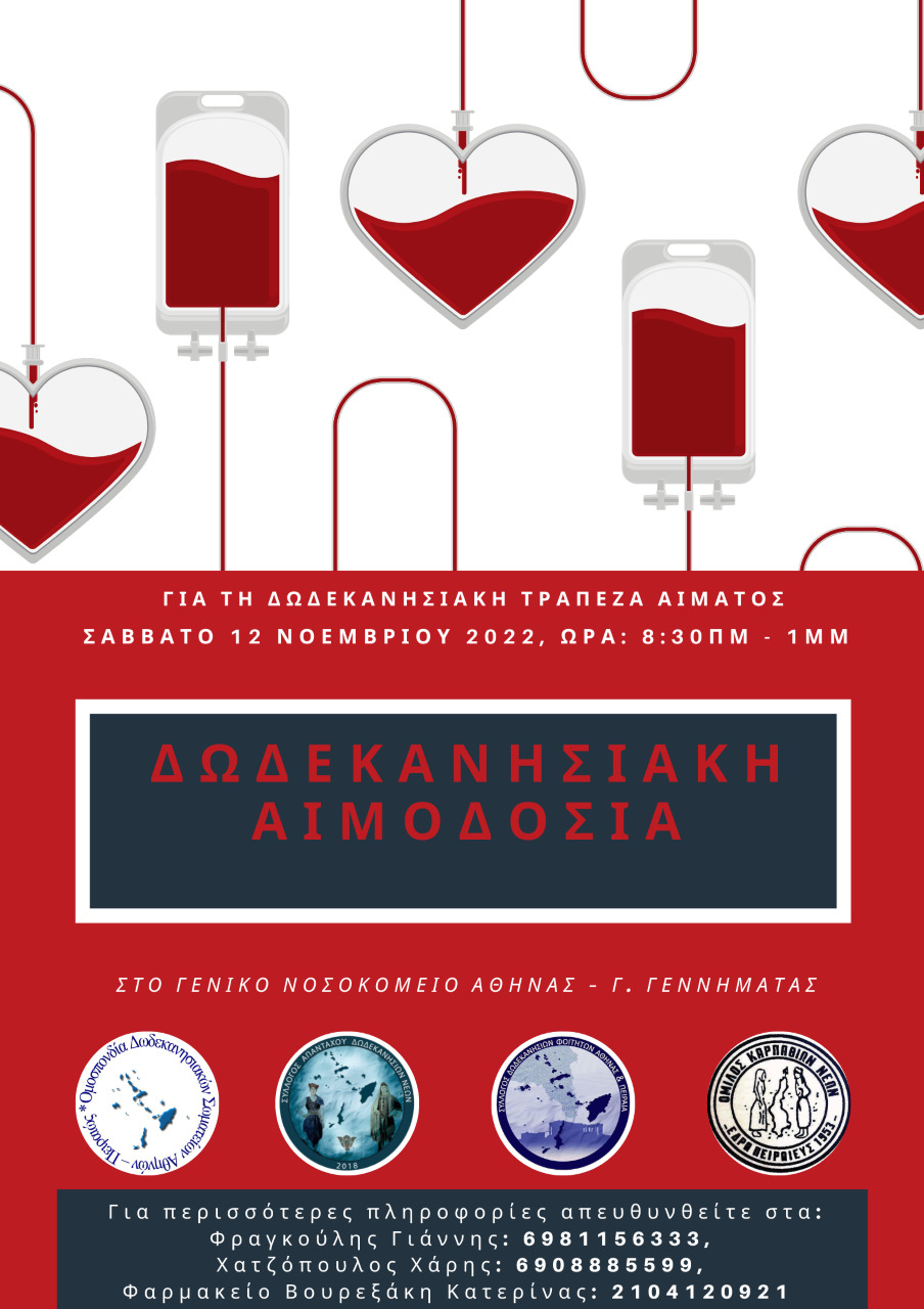Υπό την αιγίδα της Ομοσπονδίας Δωδεκανησιακών Σωματείων Αθηνών – Πειραιώς και τη συμμετοχή των τριών συλλόγων της δωδεκανησιακής νεολαίας μας διοργανώνεται το Σάββατο 12 Νοεμβρίου, από τις 8:30 π.μ έως τη 1:00 μ.μ εθελοντική αιμοδοσία στο Γενικό Νοσοκομείο Αθηνών “Γεώργιος Γεννηματάς” (Λεωφ. Μεσογείων 154, Αθήνα 115 27). Η πρόσβαση είναι εύκολη καθώς το Νοσοκομείο βρίσκεται απέναντι από το Σταθμό Μετρό “Εθνική Άμυνα”.
