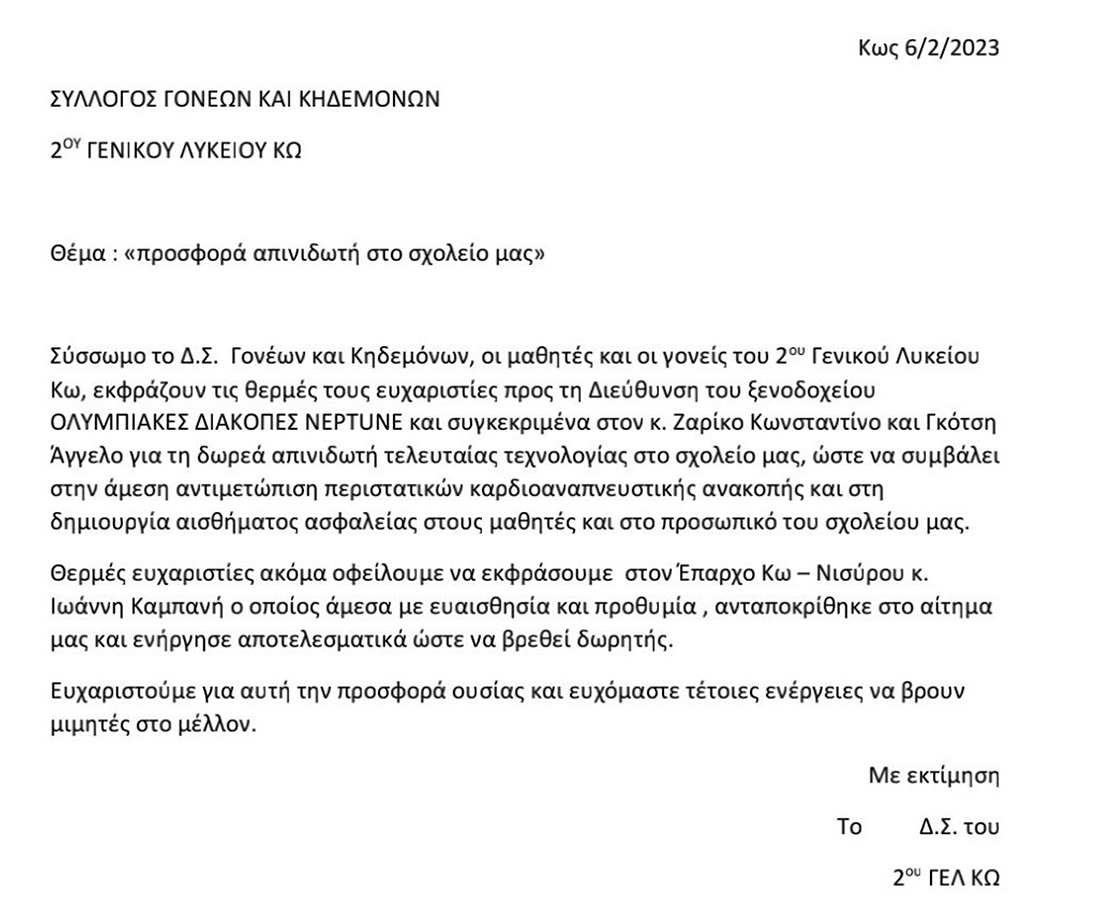 Ευχαριστήριο του 2ου Λυκείου Κω στο ξεν. "Neptune" και στον Έπαρχο για τη δωρεά απινιδωτή