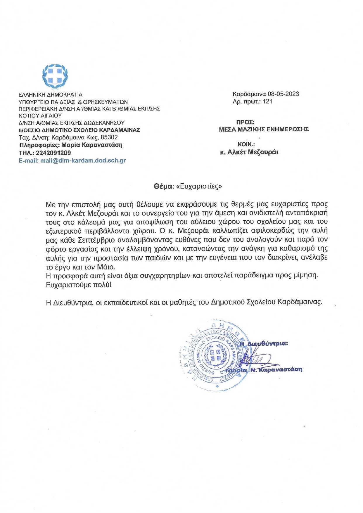Ευχαριστήριο του Δημοτικού Σχολείου Καρδάμαινας προς τον κ. Αλκέτ Μεζουράι