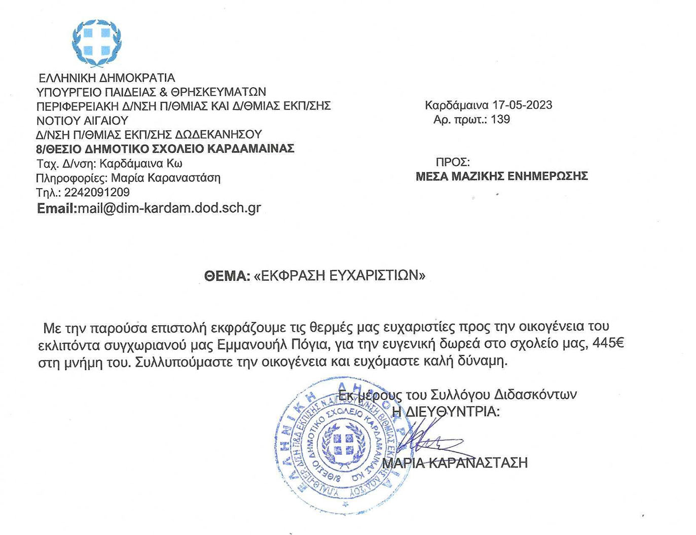 Ευχαριστήριο του Δημοτικού Σχολείου Καρδάμαινας στην οικογένεια του Εμμανουήλ Πόγια