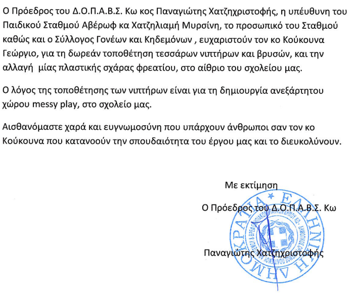 Ευχαριστήριο του ΔΟΠΑΒΣ προς τον κ. Γεώργιο Κούκουνα