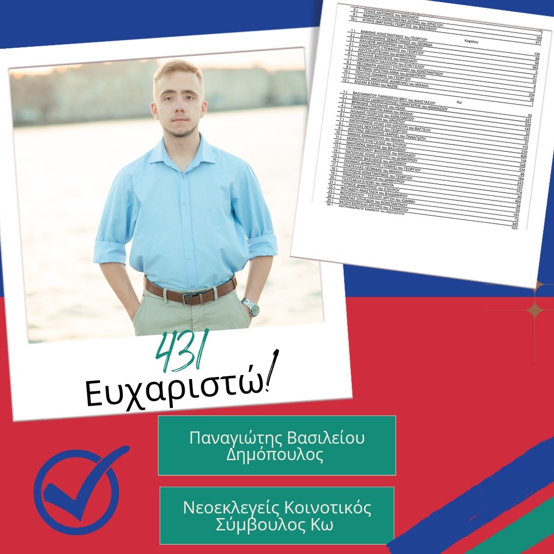 Η εκλογή μου στο κοινοτικό συμβούλιο της πόλης θα αποτελέσει δέσμευση να είμαι δίπλα σε όλους τους κατοίκους όχι μόνο της πόλης, αλλά και όλου του νησιού προκειμένου να κάνουμε την Κω ακόμα πιο ισχυρή!!