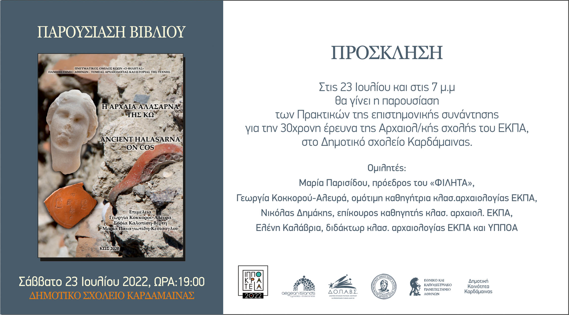 Ο  Π.Ο. Κώων «Ο ΦΙΛΗΤΑΣ», η Περιφέρεια Νοτίου Αιγαίου, το Εθνικό Καποδιστριακό Πανεπιστήμιο Αθηνών και ο Δ.Ο.Π.Α.Β.Σ. στα πλαίσια των Θερινών Ιπποκρατείων 2022 παρουσιάζουν το Σάββατο 23 Ιουλίου και ώρα 19:00 στο Δημοτικό Σχολείο Καρδάμαινας τα Πρακτικά της 30χρονης έρευνας της Αρχαιολογικής σχολής του ΕΚΠΑ για την Αρχαία Αλάσαρνα της Κω.