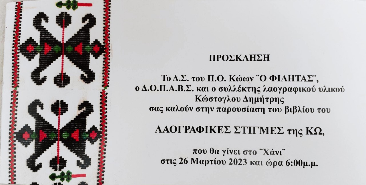 Το Δ.Σ. του Π.Ο. Κώων «Ο Φιλητάς» και ο συλλέκτης Λαογραφικού υλικού Δημήτρης Κώστογλου με την στήριξη του ΔΟΠΑΒΣ παρουσιάζουν το βιβλίο του με τίτλο «Λαογραφικές στιγμές της Κω» την Κυριακή 26 Μαρτίου στις 18:00 στο Ιστορικό Λαογραφικό Μουσείο (Χάνι)