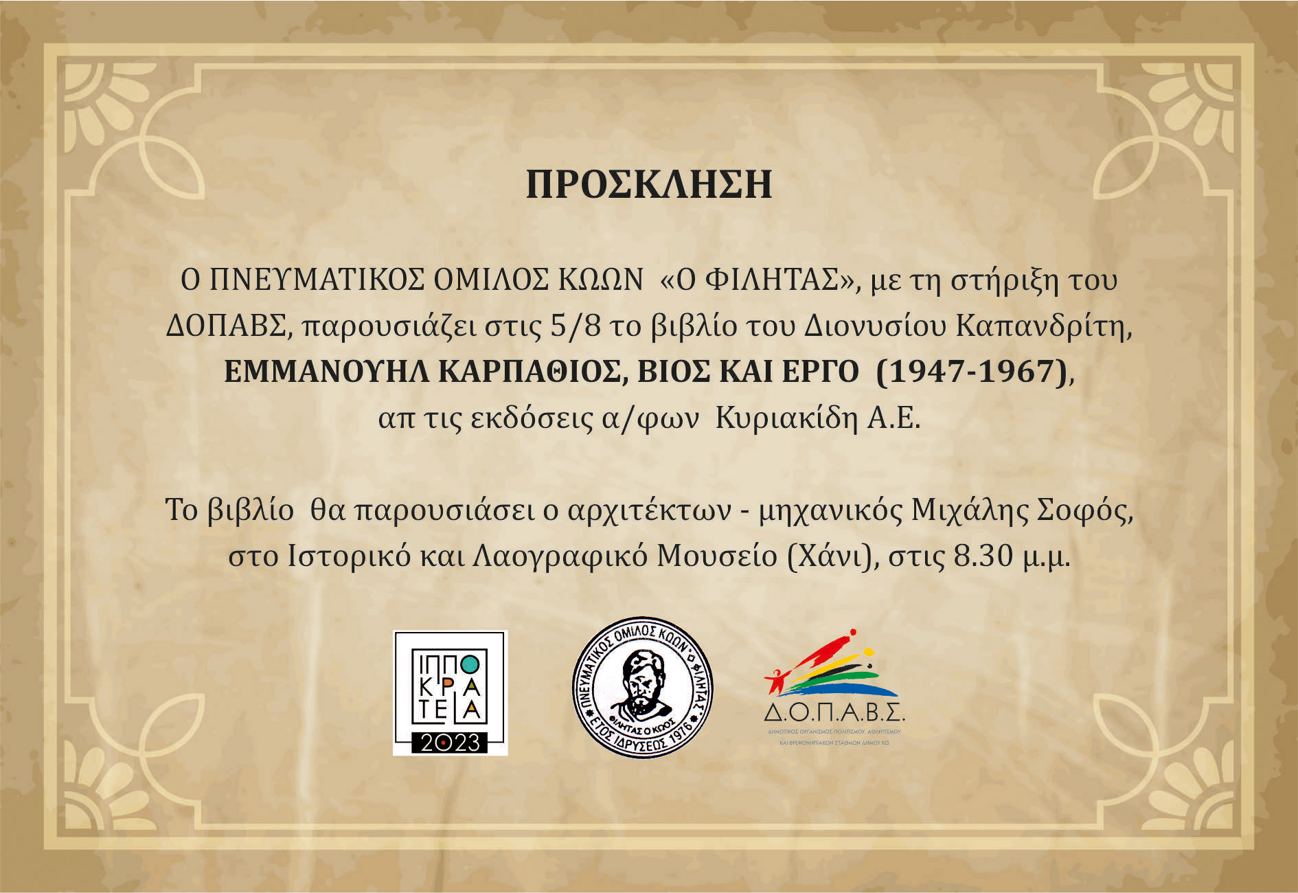 Εκδήλωση για την παρουσίαση του βιβλίου του Διονυσίου Καπανδρίτη με τίτλο “Εμμανουήλ Καρπάθιος, Βίος και Έργο 1947-1967” από τις Εκδόσεις Α/φων Κυριακίδη Α.Ε. διοργανώνει ο Πνευματικός Όμιλος Κώων Ο Φιλητάς με τη στήριξη του ΔΟΠΑΒΣ στα Θερινά Ιπποκράτεια 2023 το Σάββατο 5 Αυγούστου στις 8.30 το βράδυ στο Ιστορικό και Λαογραφικό Μουσείο Κω (Χάνι).