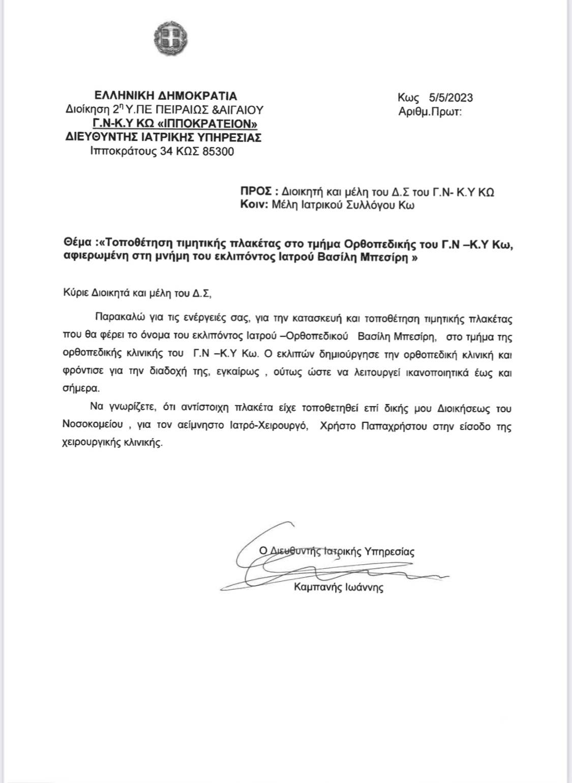 Γ. Καμπανής: Τοποθέτηση τιμητικής πλακέτας στο τμήμα Ορθοπεδικής του ΓΝ-ΚΥ Κω με το όνομα του Βασίλη Μπεσίρη