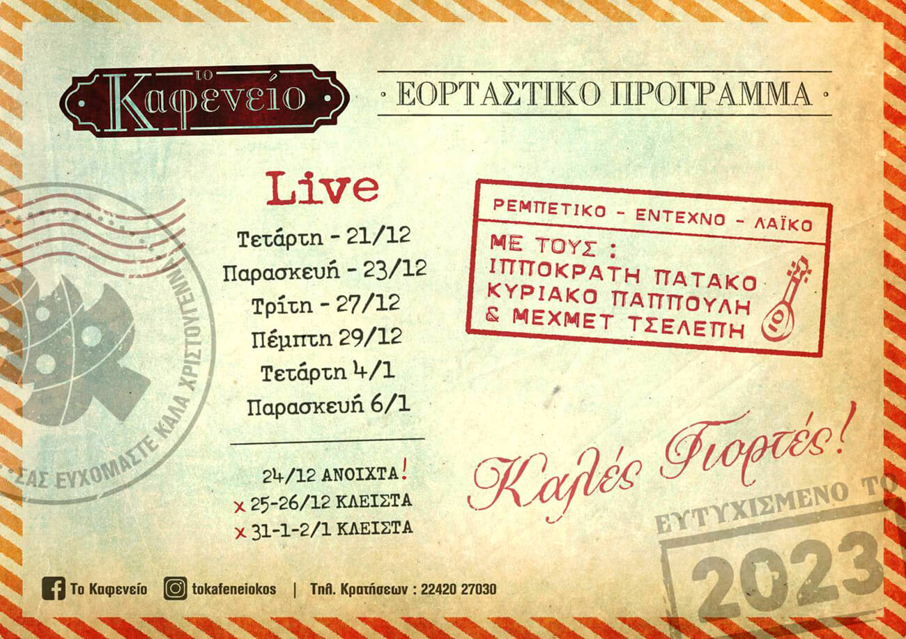 Εκλεκτοί μεζέδες, ζεστή και γιορτινή ατμόσφαιρα δίπλα στο τζάκι και η γνωστή, πετυχημένη μουσική συνταγή με τους Κυριάκο Παππούλη, Ιπποκράτη Πατάκο και Μεχμέτ Τσελεπή, θα κάνουν και φέτος την περίοδο των Εορτών λίγο πιο… μαγική…