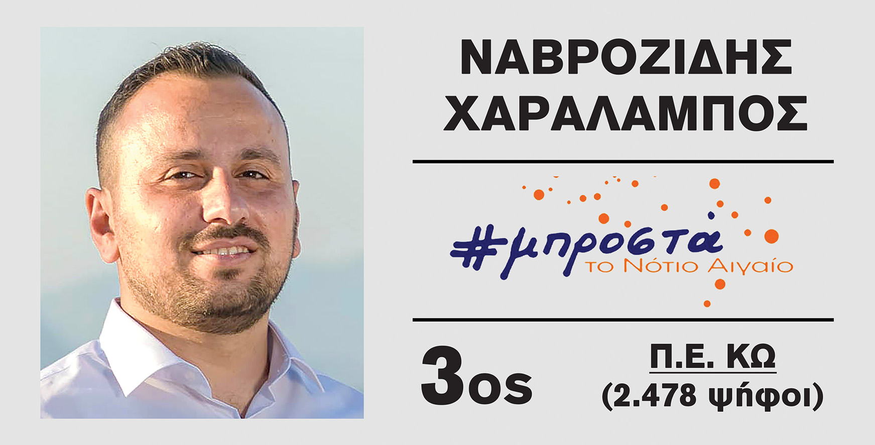 Πιο συγκεκριμένα, η παράταξη του κ. Χατζημάρκου «Μπροστά το Ν. Αιγαίο» καταλαμβάνει 3 έδρες (Ντίνα Σβύνου, Γιάννης Κρητικός και Χαράλαμπος Ναβροζίδης), η παράταξη του κ. Παπανικόλα «Νέα Εποχή για το Ν. Αιγαίο», παίρνει μία έδρα (Ευτυχία Σταθοπούλου) και η παράταξη της κ. Χ. Καραγιάννη «Ανοιχτοί Ορίζοντες» 1 έδρα (Διονυσία Κασσιώτη).
