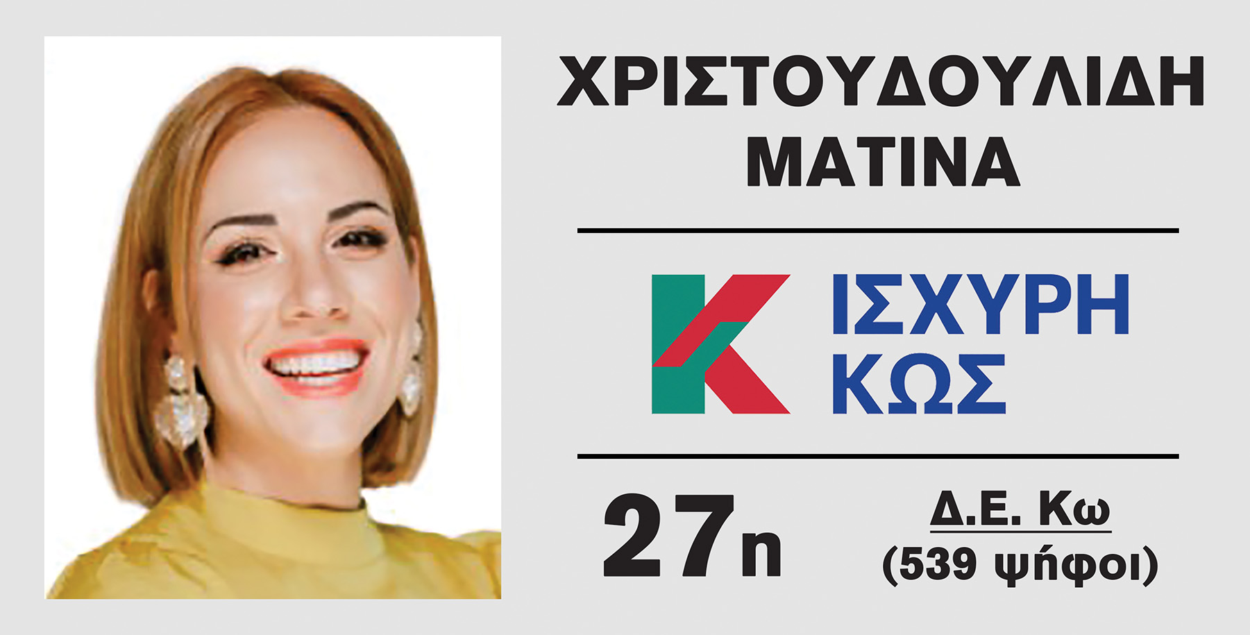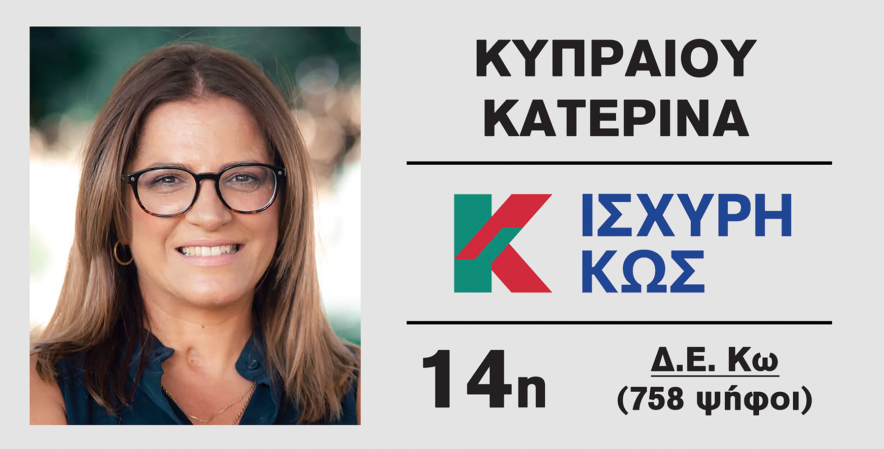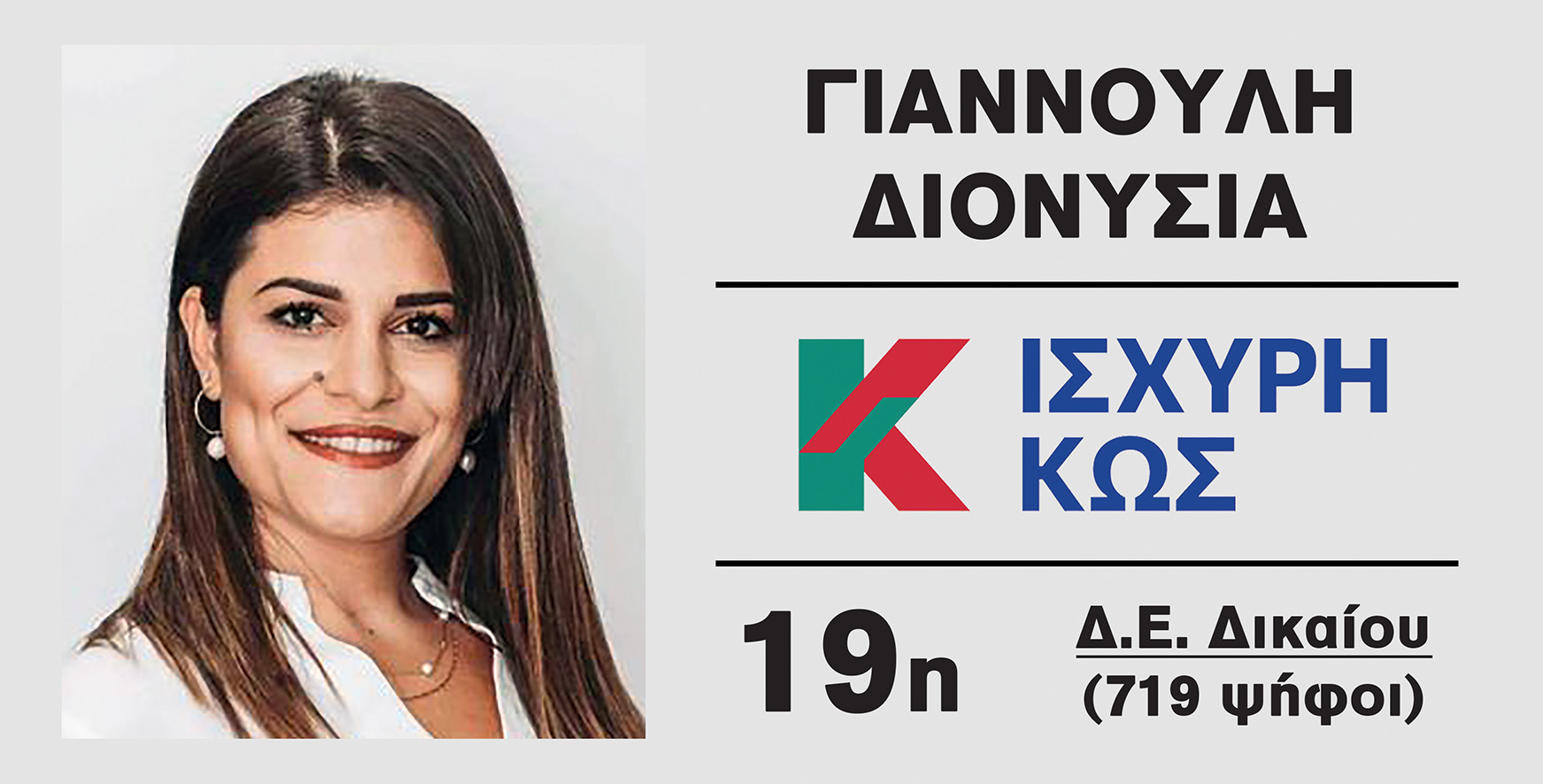 Θέλω να ευχαριστήσω όλους όσοι μας στήριξαν, τόσο την παράταξη, όσο και εμένα προσωπικά, καθώς στην παρθενική μου προσπάθεια, με εξέλεξαν Δημοτική Σύμβουλο, δίνοντάς μου την ευκαιρία να κάνω ένα όνειρο μου πραγματικότητα. Επίσης ευχαριστώ και την οικογένειά μου και τους φίλους για την στήριξή τους και δεσμεύομαι ότι θα δώσω τον καλύτερό μου εαυτό, από όποιο πόστο και αν μου ανατεθεί από τον Δήμαρχο, για να προσφέρω στους συνδημότες μου και να παλέψω για την Κω μας.