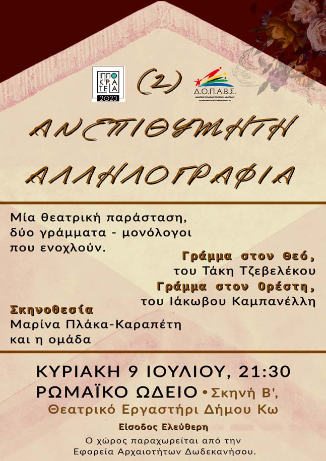 Τη θεατρική παράσταση Ανεπιθύμητη Αλληλογραφία (2) Γράμμα στον Θεό του Τάκη Τζεβελέκου και Γράμμα στον Ορέστη του Ιάκωβου Καμπανέλλη παρουσιάζει το Θεατρικό Εργαστήρι Δήμου Κω Σκηνή Β΄ την Κυριακή 9 Ιουλίου στις 9.30 το βράδυ στο Ρωμαϊκό Ωδείο στα Θερινά Ιπποκράτεια 2023.