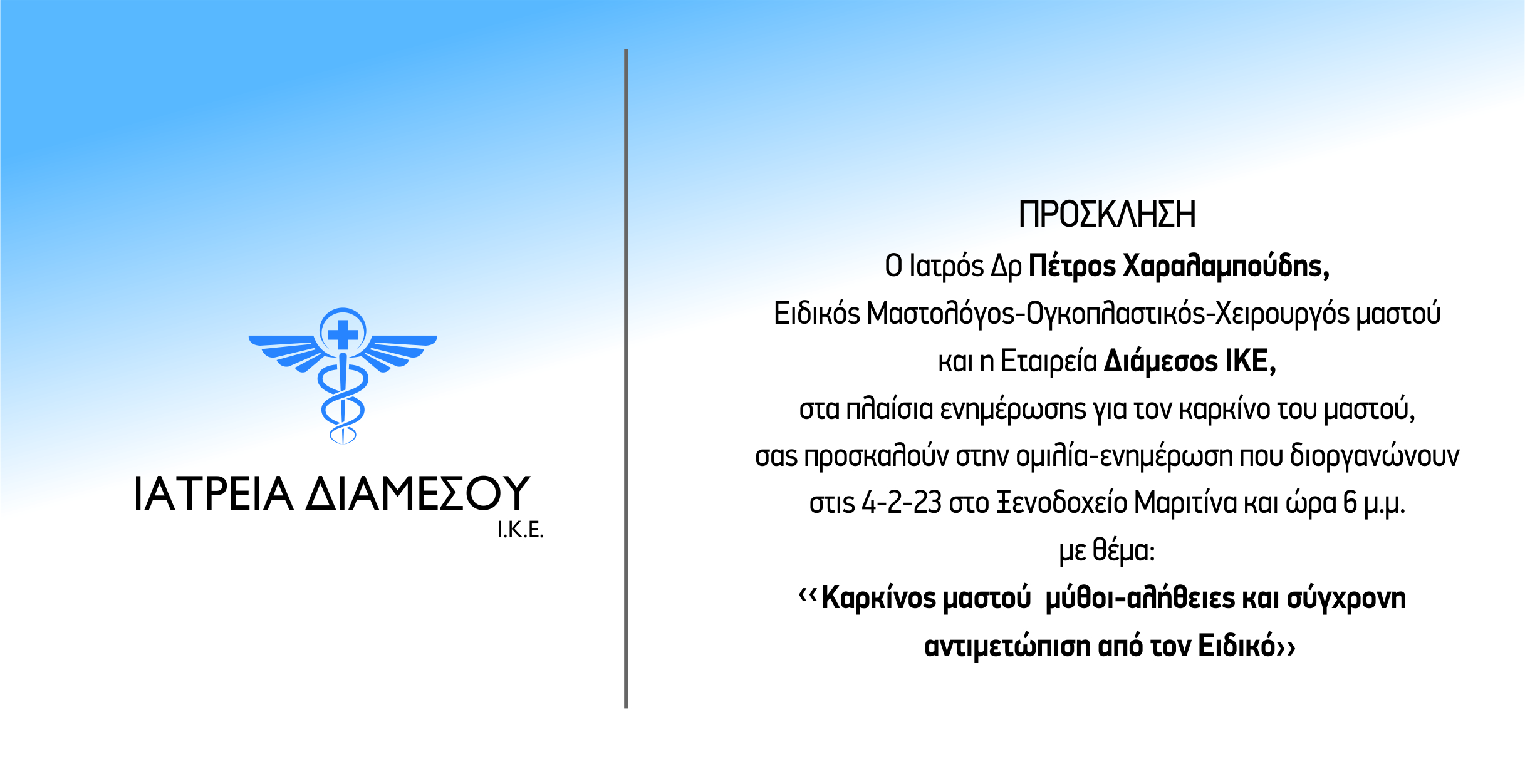 “Ιατρεία Διαμέσου”: Πρόσκληση σε ενημερωτική ομιλία για τον καρκίνο του μαστού με το Δρ. Π. Χαραλαμπούδη