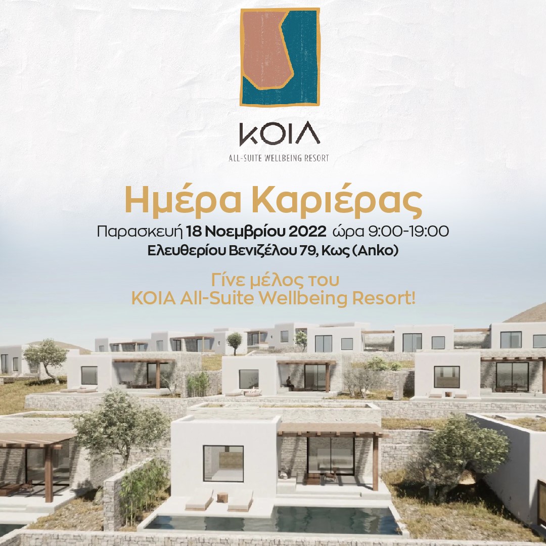 Στο πλαίσιο προετοιμασίας για τη νέα τουριστική σεζόν, το Koia διοργανώνει Ημέρα Καριέρας για την πρόσληψη προσωπικού, υπό την αιγίδα της Τουριστικής Σχολής Anko.