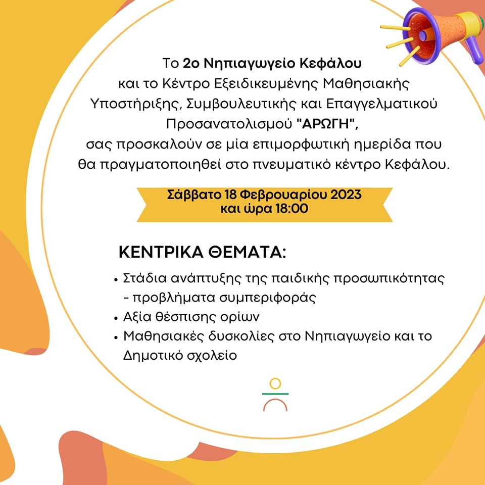 Με χαρά σας προσκαλούμε στην ημερίδα που διοργανώνουμε το ερχόμενο Σάββατο σε συνεργασία με το 2ο Νηπιαγωγείο Κεφάλου στο πνευματικό κέντρο του χωριού!