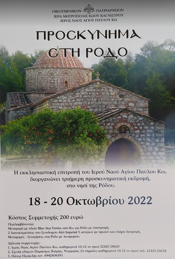 Η εκκλησιαστική επιτροπή του Αγ. Παύλου ενορία Κω διοργανώνει Προσκυνηματική εκδρομή στη Ρόδο 18 – 20 Οκτωβρίου 2022.