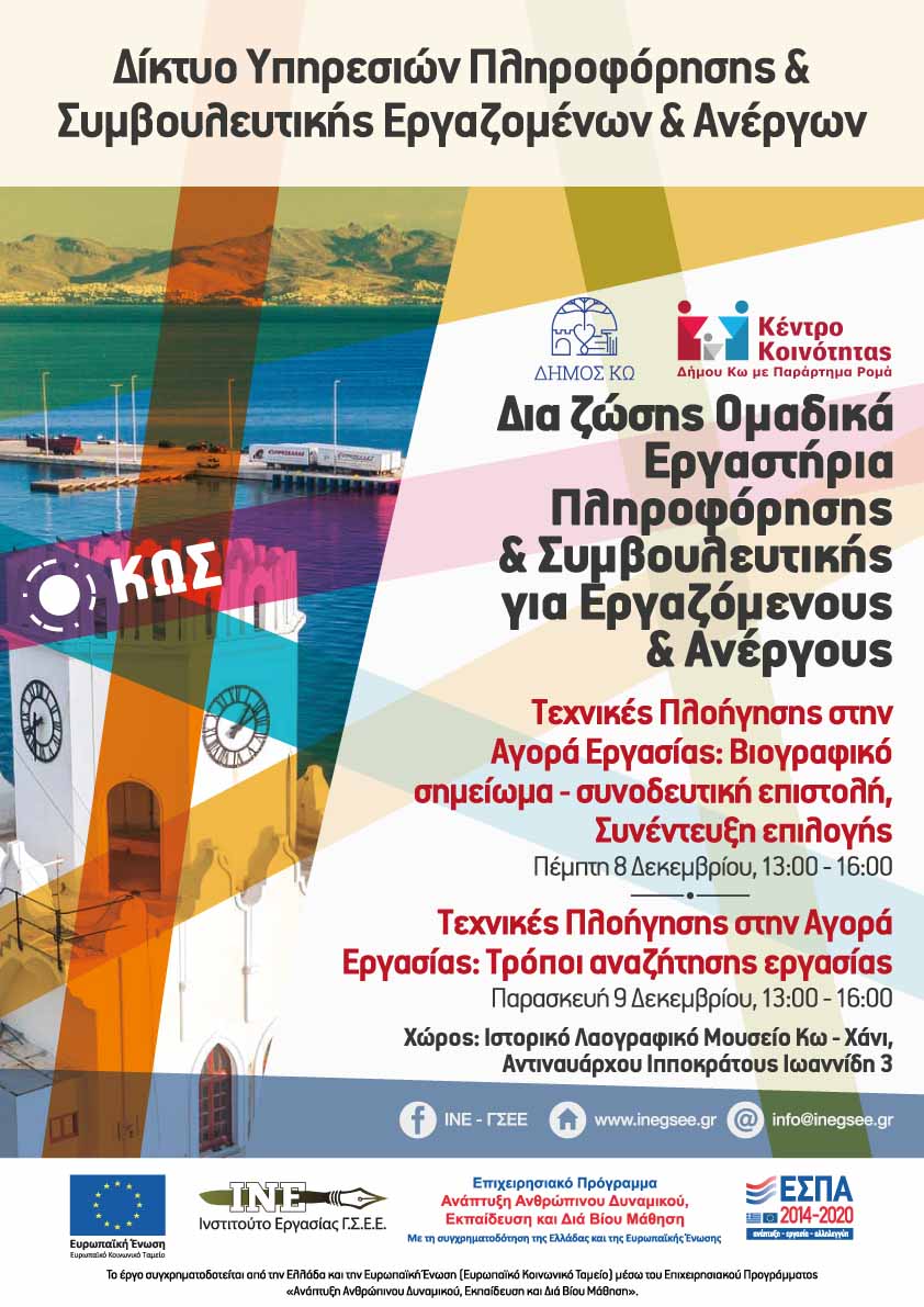 Το Δίκτυο Πληροφόρησης και Συμβουλευτικής Εργαζομένων και Ανέργων του ΙΝ.Ε. - Γ.Σ.Ε.Ε. σε συνεργασία με το Κέντρο Κοινότητας με Παράρτημα Ρομά Δήμου Κω θα υλοποιήσει για τον μήνα Δεκέμβριο ομαδικά εργαστήρια πληροφόρησης και συμβουλευτικής για ανέργους και εργαζόμενους.
