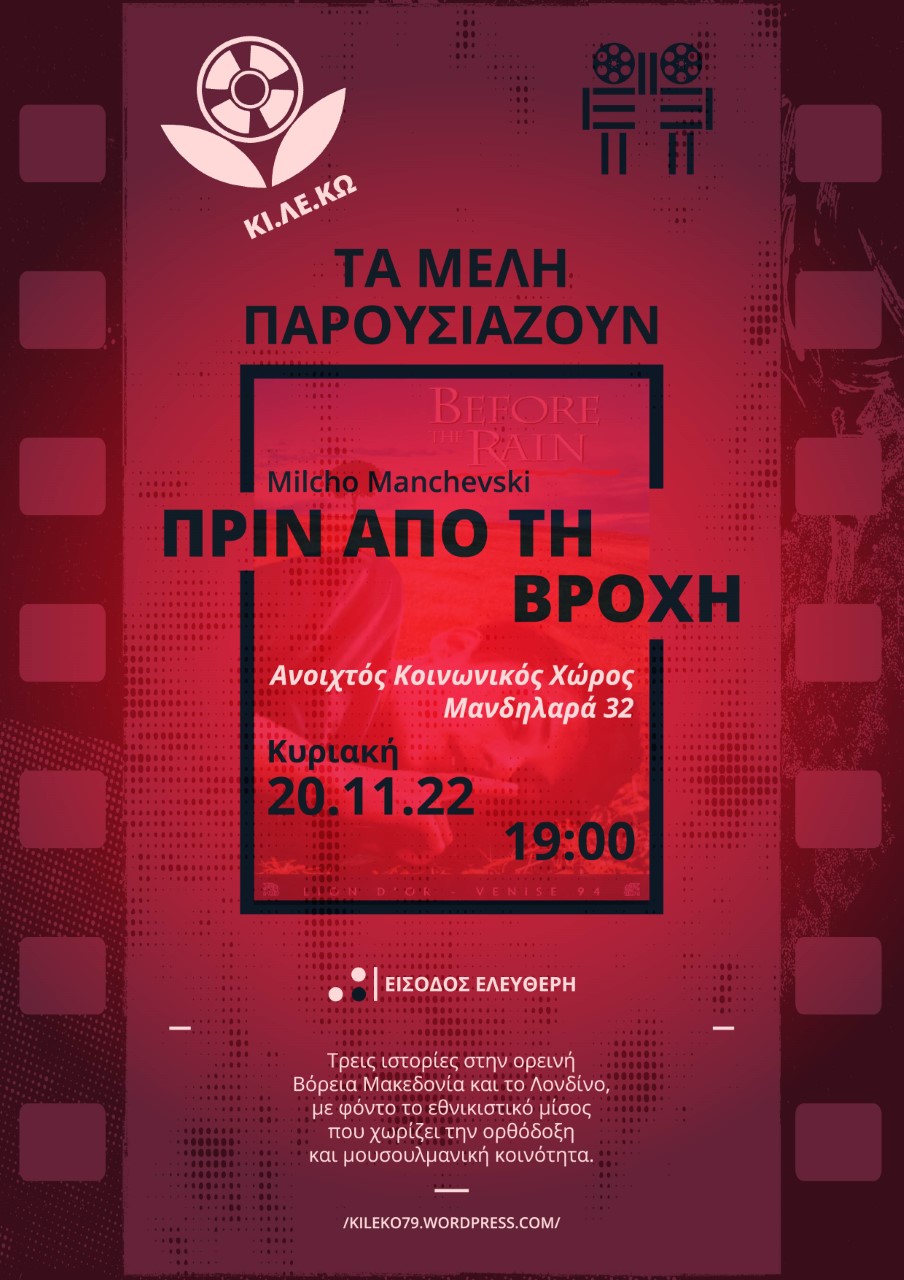 Τα μέλη παρουσιάζουν, στον φιλόξενο Ανοιχτό Κοινωνικό Χώρο Μανδηλαρά 32, όπου κάθε μέλος θα έχει την ευκαιρία να παρουσιάσει και να ανοίξει συζήτηση για μια αγαπημένη του ταινία, μοιράζοντας έτσι τις εμπειρίες, τις σκέψεις και τα συναισθήματά του με όλους εμάς. Πρώτη προβολή την Κυριακή 20/11 στις 19:00, με τη δραματική ταινία του Μίλτσο Μαντσέφσκι Πριν από τη βροχή.
