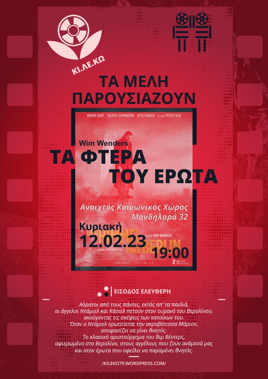 H ΚΙ.ΛΕ.ΚΩ συνεχίζει και τη νέα χρονιά τη δράση προβολών Τα μέλη παρουσιάζουν, στον φιλόξενο Ανοιχτό Κοινωνικό Χώρο Μανδηλαρά 32, όπου κάθε μέλος έχει την ευκαιρία να παρουσιάσει και να ανοίξει συζήτηση για μια αγαπημένη του ταινία, μοιράζοντας έτσι τις εμπειρίες, τις σκέψεις και τα συναισθήματά του με όλους εμάς. Σας περιμένουμε την Κυριακή 12/02 στις 19:00, για να γιορτάσουμε νωρίτερα τον Άγιο Βαλεντίνο, με μία από τις πιο ρομαντικές ταινίες φαντασίας όλων των εποχών, Τα φτερά του έρωτα του Βιμ Βέντερς.