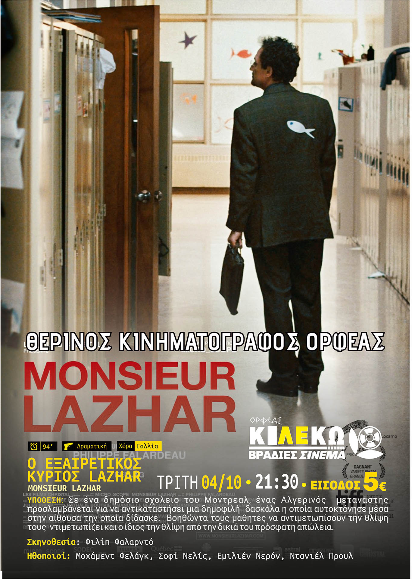 Ακόμα και μέσα στο φθινόπωρο, καιρού επιτρέποντος, η ΚΙ.ΛΕ.ΚΩ επανέρχεται για μια ακόμα βραδιά σινεμά στον Θερινό Κινηματογράφο Ορφέα, την Τρίτη 4/10 στις 21:30, με το βραβευμένο τρυφερό δράμα του Φιλίπ Φαλαρντό O Εξαιρετικός Κύριος Lazhar.