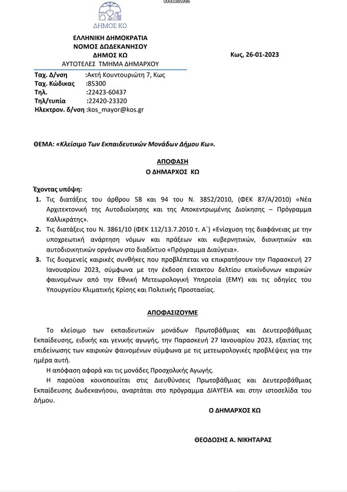 Κλειστά και στην Κω αύριο τα σχολεία, λόγω κακοκαιρίας - Τι αποφάσισε ο Δήμος