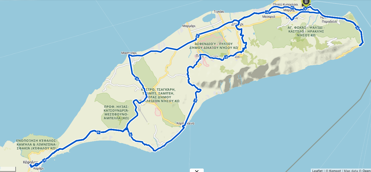 Η συνολική απόσταση γι’ αυτή την βόλτα είναι 112 χιλιόμετρα και προετοιμαστείτε για 1080μ. ανάβασης. Οι κλίσεις είναι ήπιες – εκτός από την ανάβαση προς την Αντιμάχεια, στη συνέχεια στην Καρδάμαινα και μετά τα ορεινά χωριά. Όμως κι εκεί δεν ξεπερνά το 10%.