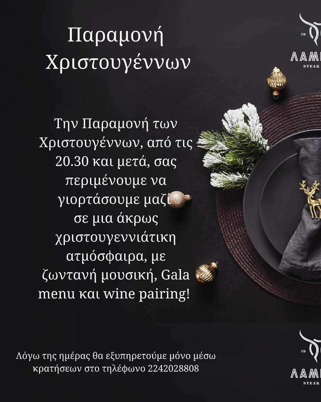 Την Παραμονή των Χριστουγέννων, από τις 20.30 και μετά, σας περιμένουμε να γιορτάσουμε μαζί σε μια άκρως χριστουγεννιάτικη ατμόσφαιρα, με ζωντανή μουσική, Gala menu και wine pairing!